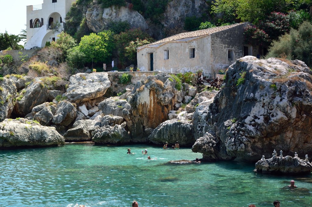 Cala Rossa, a Favignana, è un capolavoro di roccia e mare. Le bianche scogliere calcaree con striature orizzontali circondano una baia senza spiaggia, dove si prende il sole sulle rocce. Il mare turchese è così limpido da sembrare trasparente. Maschera e boccaglio sono un must per esplorare grotte e insenature.