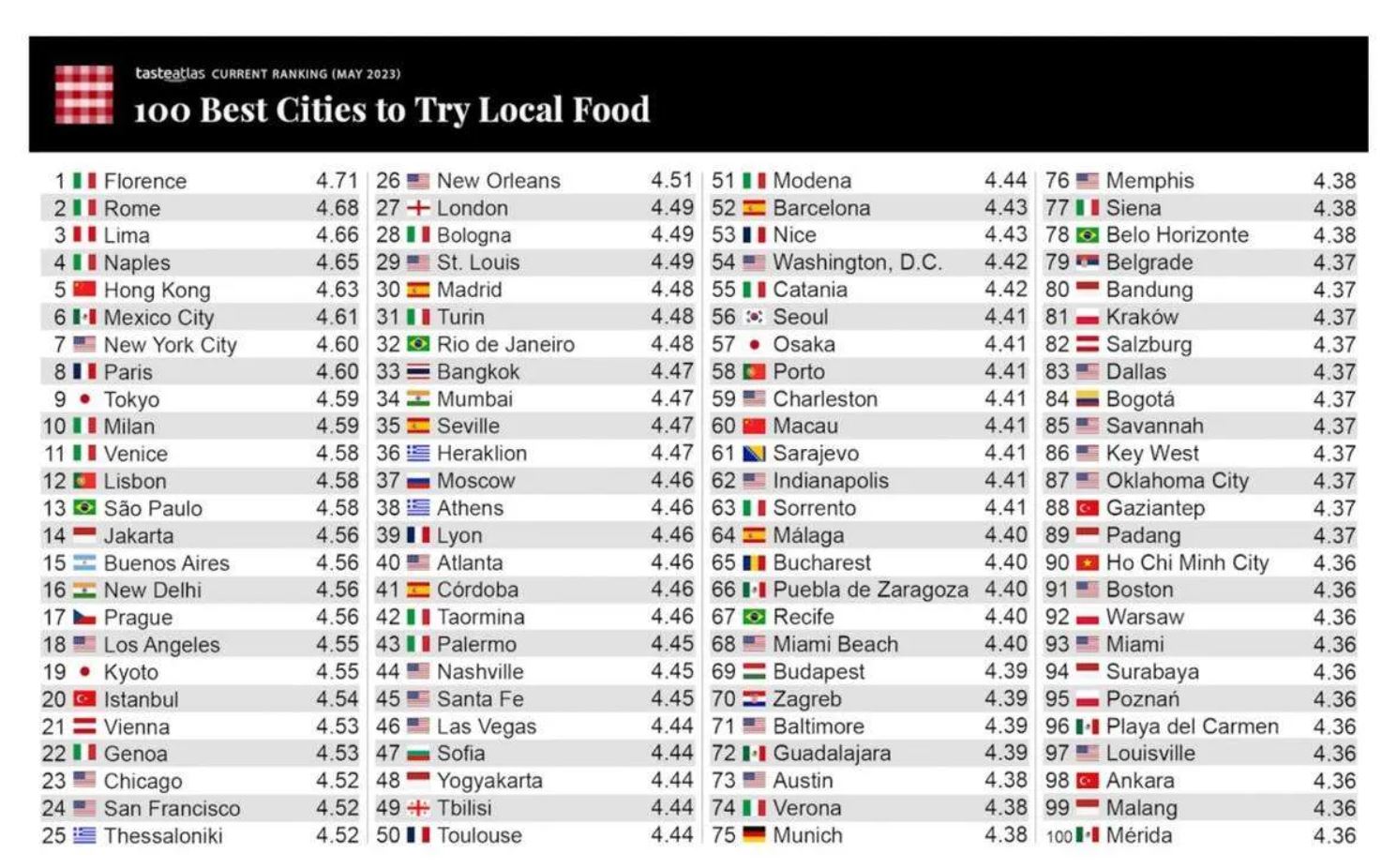 Per arrivare alle 100 città in cui si mangia meglio al mondo, il sito ha analizzato le valutazioni della cucina locale, di quella nazionale e dei migliori ristoranti. Il portale ha così pubblicato la sua classifica delle migliori città a livello globale, in cui gustare il cibo locale. Sul podio ci sono due italiane, cioè Firenze (al primo posto) e Roma (seconda). Quarta posizione per Napoli, decima per Milano. A rappresentare la Sicilia sono tre destinazioni: troviamo Taormina al 42esimo posto, Palermo subito dopo e, al 50esimo posto, Catania.
