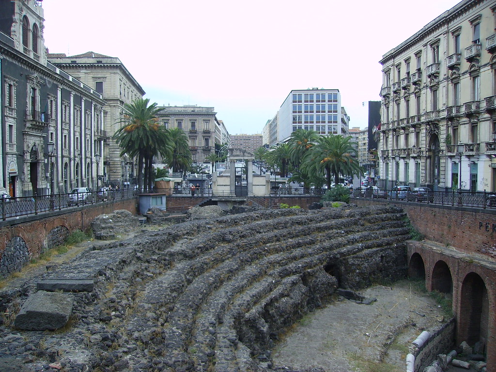 Sotto la Piazza Stesicoro si trova un antico teatro romano, risalente al I secolo a.C. Questo tesoro archeologico è stato sepolto nel corso dei secoli da varie eruzioni dell’Etna e dagli eventi sismici. Solo una piccola parte è stata finora riportata alla luce, ma rappresenta un affascinante pezzo di storia nascosto nel cuore della città.