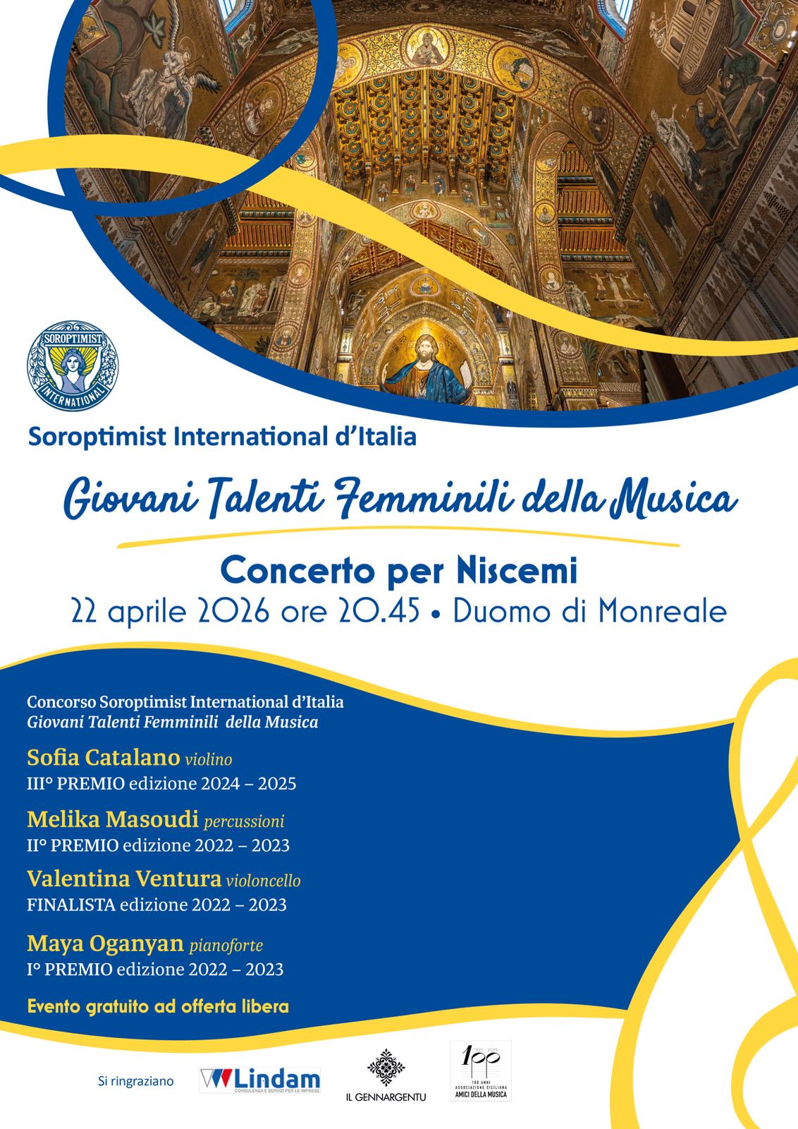 Soroptimist International d’Italia e Club di Palermo insieme per Niscemi- Emozioni in musica con il “Concerto per Niscemi” al Duomo di Monreale, promosso dal Soroptimist International d’Italia in collaborazione con il club di Palermo. Evento unico in Italia. Appuntamento mercoledì 22 aprile alle 20,45 con le vincitrici del concorso nazionale ” Giovani talenti femminili per la musica”. I proventi della serata, per finanziare un’aula didattica e un laboratorio per lo studio della fragilità del territorio di Niscemi.