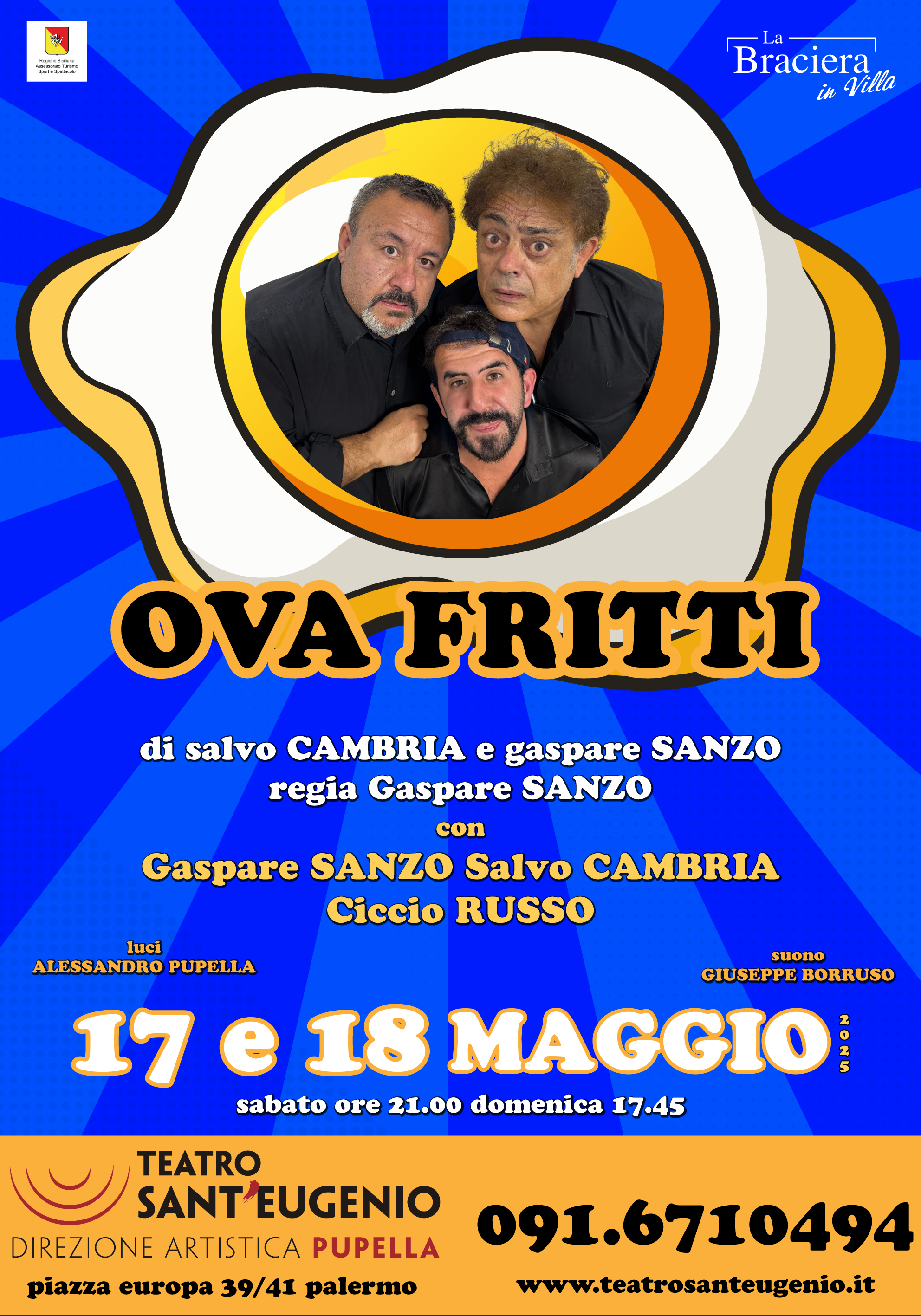 Sabato 17 e domenica 18 maggio, al teatro Sant’Eugenio di Palermo – Direzione artistica Pupella, sarà protagonista la commedia ‘’Ova fritti’’ di Salvo Cambria e Gaspare Sanzo che la interpretano insieme a Ciccio Russo, per la regia di Gaspare Sanzo. Lo spettacolo, il sabato andrà in scena alle ore 21, mentre la domenica avrà inizio alle 17.45, e chiude la Stagione 2024-2025 del Sant’Eugenio.