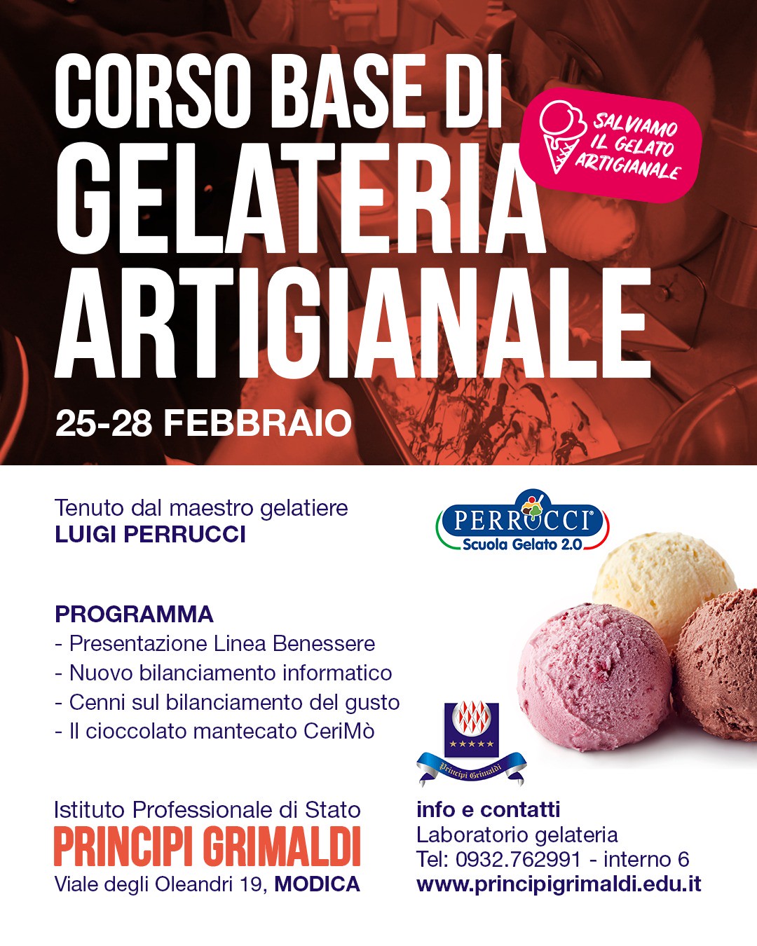 MODICA – Il gelato artigianale non è soltanto un prodotto: è cultura, identità, mestiere antico. E dalla Sicilia, terra simbolo di granite, sorbetti e coni che profumano di mandorla e pistacchio, viene rilanciato un messaggio forte e chiaro: tutelare l’artigianalità, difendere la qualità, formare le nuove generazioni. È questo lo spirito del corso base di gelateria artigianale in programma dal 25 al 28 febbraio all’Istituto professionale di Stato “Principi Grimaldi” di Modica. Un’iniziativa che si inserisce nella campagna nazionale “Salviamo il gelato artigianale”, movimento che richiama l’attenzione su un settore messo alla prova dall’industrializzazione e dalla standardizzazione dei gusti. A guidare il percorso formativo sarà Luigi Perrucci, maestro gelatiere e fondatore della “Perrucci Scuola Gelato 2.0”, professionista riconosciuto a livello nazionale per la sua attività di formazione e ricerca nel campo del gelato contemporaneo.
