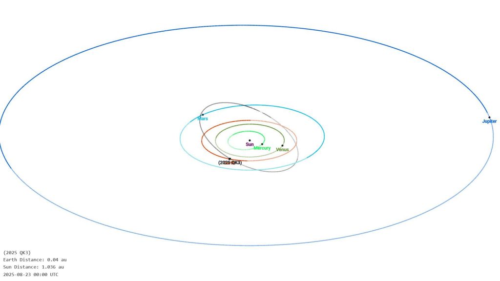 L’asteroide 2025 QK3 impiega 435 giorni per completare un’orbita intorno al Sole e ha un’inclinazione di 24 gradi rispetto a quella terrestre. Non è destinato a entrare in collisione con la Terra e le stesse condizioni geometriche si ripeteranno solo il 26 agosto 2081, quando passerà nuovamente vicino al nostro pianeta.