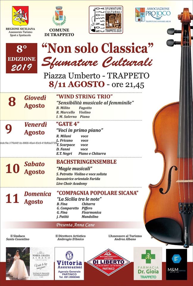 Dopo il successo delle passate edizioni, torna a Trappeto “Non solo classica – sfumature culturali” 2019. Dall’8 all’11 agosto, tutte le sere a partire dalle 21:30 a piaz...