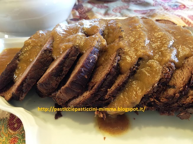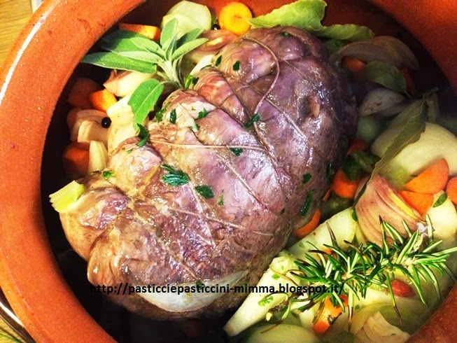 – cuocere a fuoco bassissimo per 2 ore e 1\2 , girando la carne un paio di volte, durante questo tempo e aggiungendo un pò di vino della marinata, qualora si asciugasse troppo con la cottura