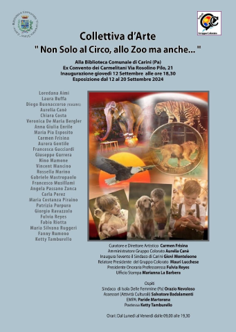 Il prossimo 12 settembre, alle ore 18.30, la Biblioteca Comunale Francesco Scavo di Carini, in provincia di Palermo, in via Rosolino Pilo 21, farà da cornice all’inaugurazione della collettiva d’arte “Non solo al circo, allo zoo ma anche…”, curata da Carmen Frisina. La mostra rappresenta un’occasione imperdibile per gli amanti dell’arte e della cultura, offrendo uno sguardo creativo su temi che vanno oltre il mondo animale, esplorando nuovi spunti di riflessione e immaginazione.