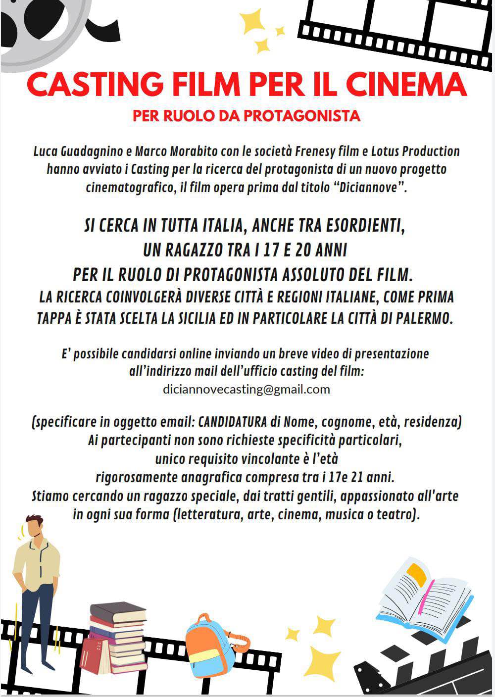 Luca Guadagnino (in veste di produttore) e Marco Morabito, con le società Frenesy film e Lotus Production, hanno avviato i casting per la ricerca del protagonista di un nuovo progetto cinematografico: il film opera prima dal titolo “Diciannove“. Le selezioni coinvolgeranno diverse città e regioni italiane e, come prima tappa, è stata scelta la Sicilia (in particolare la città di Palermo).