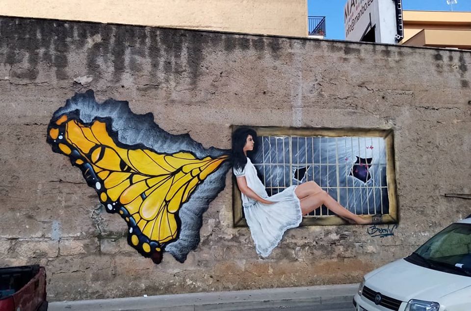 La Sicilia come un paio d'ali: è l'opera d'arte di Beny Vitale, in arte Trebel, realizzata a Cinisi (Palermo), secondo dei murales commissionati dall'amministrazione comunale. Lun...