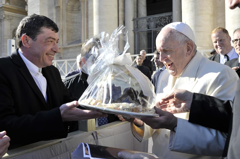 Papa Francesco ha ricevuto in dono la manna siciliana. I rappresentanti del Consorzio Manna Madonita di Castelbuono (Palermo), insieme al maestro pasticciere Nicola Fiasconaro, han...