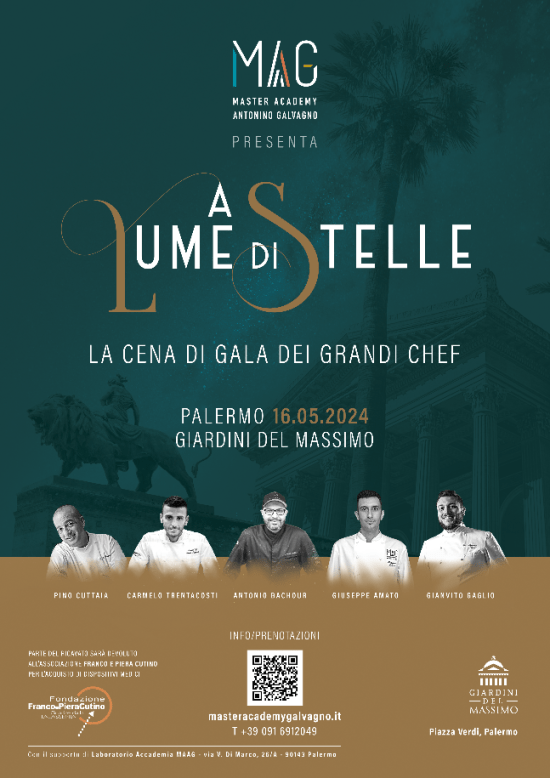 La cena dei grandi chef si terrà ai “Giardini del Massimo”, ristorante all’interno dello splendido Teatro Massimo di Palermo. Una serata straordinaria che proietterà gli ospiti in un viaggio sensoriale grazie alla partecipazione di Pino Cuttaia del ristorante La Madia, 2 stelle Michelin a Licata nell’agrigentino; Carmelo Trentacosti del MEC, 1 stella Michelin a Palermo; Giuseppe Amato, miglior pasticcere da ristorazione al mondo per l’associazione Les Grandes Tables du Monde nel 2021 e direttore della Mag Academy; Gianvito Gaglio, chef resident dei Giardini del Massimo e, appunto, Antonio Bachour.