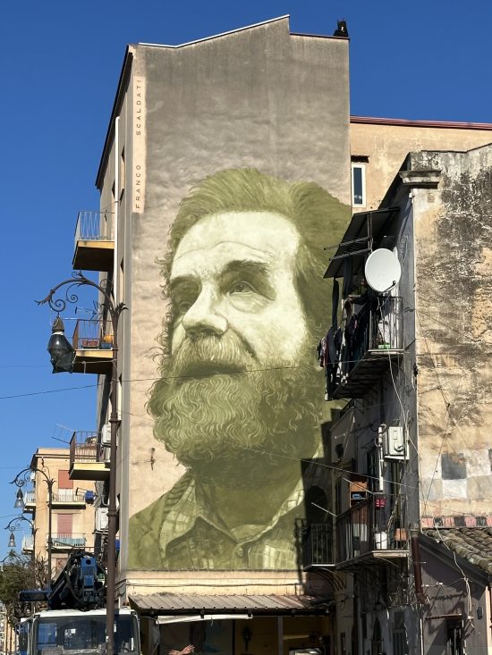 “Franco Scaldati è il poeta della nostra città, Palermo, il cantore delle viscere di questo posto – spiega Igor Scalisi Palminteri -. Lui ha saputo inabissarsi nelle ombre più profonde e cantarne la meraviglia. Ha scoperto tra le macerie quello che molti con uno sguardo superficiale non possono vedere. Lui ha lavorato in questo quartiere, qui a San Saverio, ed è qui che ho deciso di dipingere il suo volto a imperitura memoria, perché i palermitani sappiano chi è Franco Scaldati, perché lo sappia il mondo. Un poeta dimenticato o mai conosciuto, o da pochi conosciuto”.