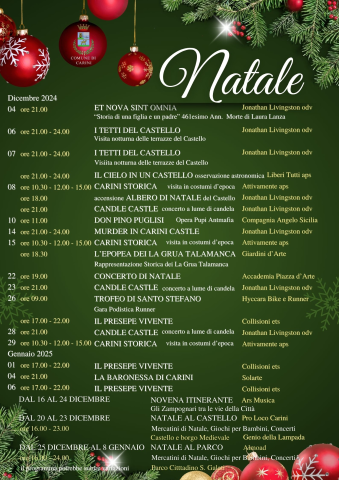 Dal 20 al 23 dicembre, il borgo circostante ospiterà i mercatini di Natale, organizzati dalla Pro Loco di Carini, con attività per bambini e concerti serali dalle ore 16 alle 23.