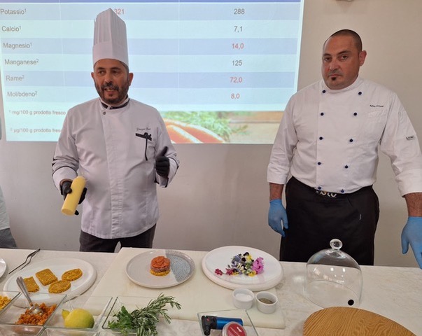 Il seminario che si è svolto questa mattina è stato coordinato dai professori di cucina Mario Dispinseri (responsabile eventi dell’IPS Federico II) e Giuseppe Bono, chef collare del “Collegium Cocorum” (onorificenza al merito rilasciata dalla Federazione Italiana Cuochi agli chefs che hanno operato oppure operano da oltre 25 anni nell’arte culinaria) che ha presentato uno sformatino di carota novella di Ispica caramellata mentre Cristian Stivala, allievo del prof. Bono, ha proposto una pizza idratata con succo di carota, condita con crema di carote, mascarpone e fior di latte, all’uscita impreziosita con mortadella di asino e fiori di sambuco. Lo chef prof. Alfio Crimi ha realizzato una brioche con granita di carota novella di Ispica.