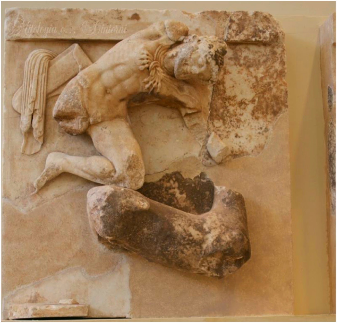 | Tesoro degli Ateniesi. Metopa nord. Eracle e la cerva, museo di Delfi. |
