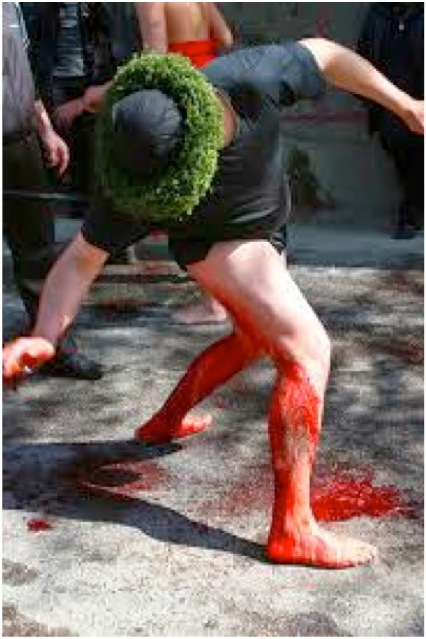 | Nocera Tirinese (Catanzaro). Processione della Settimana Santa: un Vattiente si flagella le gambe con acute punte conficcate in pezzi di sughero. |