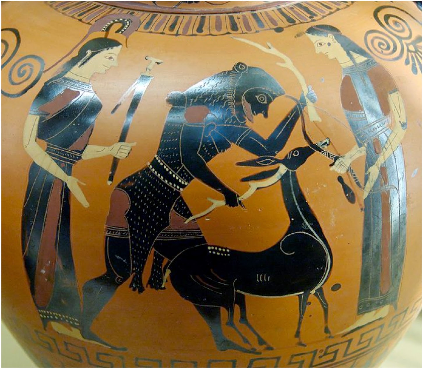 | Eracle stacca le corna d’oro alla cerva di Cerinea. La scena è dipinta su un vaso attico a figure nere rinvenuto a Vulci, datato intorno alla metà del sec. VI a.C. (London, British Museum). |