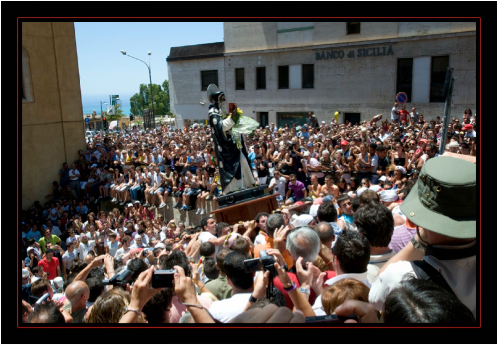 La moltitudine degli adoranti, difatti, ad ogni sosta del santo basiliano, momento questo in cui la venerazione dei fedeli raggiunge vertici frenetici e parossistici, come travolta da un acceso trasporto mistico e allo stesso tempo fisico verso il Santo, si spinge fin sopra la statua per abbracciarla, toccarla e baciarla in un’atmosfera di invasata esaltazione di carattere quasi primordiale. L’assistere a tale spettacolo, la cui regia e coreografia è palesemente ancestrale (balli del Santo, scrolloni della statua, abbacchiatura dei grappoli umani che scalano il simulacro), è, a dir poco, travolgente sul piano emotivo e finisce col rapire estaticamente tutti gli astanti.