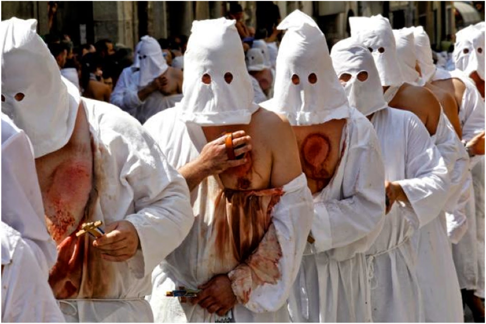 Guardia Sanframondi (Benevento). Dal 1445, ogni sette anni, i Battienti a sangue, in una processione penitenziale, si flagellano il petto con acute punte. |