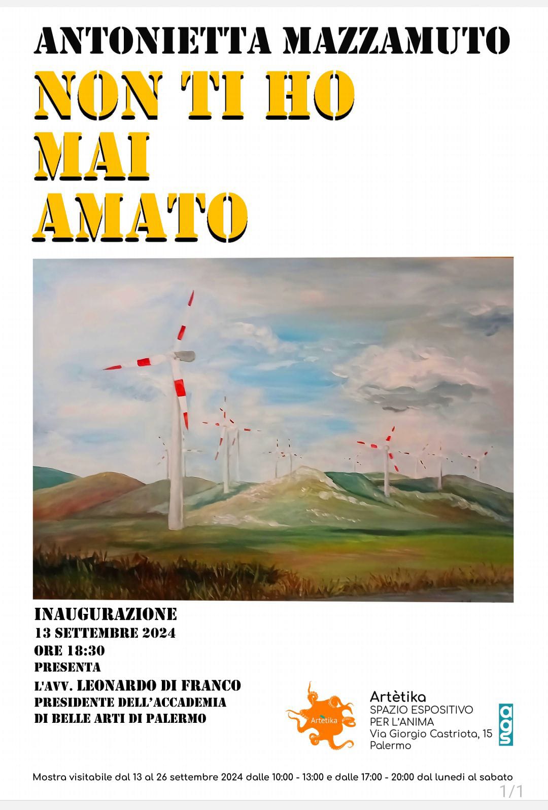 Sono venti le opere in esposizione per “Non ti ho mai amato” di Antonietta Mazzamuto, alla galleria Artètika, tra acrilici su tela, su carta ed acquerelli che raccontano un mondo ed una natura splendidi inficiati dalla mano dell’uomo. “Si pone l’accento su come ancora è la Madre Terra, con le sue bellezze e gli angoli di paradiso, ma si parla anche dei disastri, a volte irreversibili, generati dalla follia umana. La denuncia contro un mondo che non si vuole fermare a riparare i danni fatti finora. Dalle pale eoliche che svettano con insolita bellezza in un paesaggio di campagna siciliana, alle bottiglie di plastica che formano a prima vista una sorta di paesaggio industriale, con tanto di fumo grigio che esce dalle immaginarie ciminiere, dipinte con tagliente ironia” commentano le galleriste Gigliola Beniamino ed Esmeralda Magistrelli.