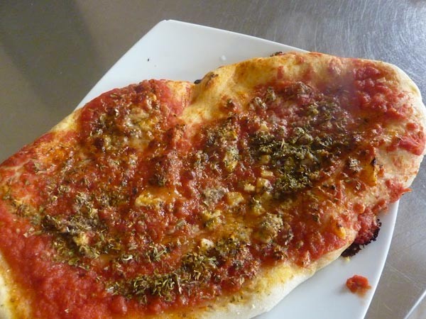 Iniziate dall’impasto. Mescolate la farina con il lievito, lo zucchero, il sale e l’acqua tiepida. Lavorate bene e fate lievitare per almeno due ore. Formate delle palline di impasto e stendete con forma ovale. Tagliate l’aglio a pezzetti e aggiungetelo alle alici, la salsa e una manciata di pecorino, olive, origano e olio d’oliva. Infornate nel forno caldo.