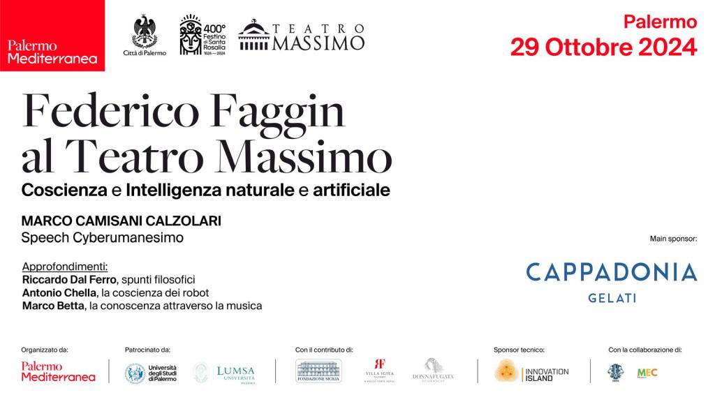 Al Teatro Massimo Federico Faggin si confronterà con Marco Camisani Calzolari, cyberumanista, docente universitario, divulgatore, dal 2017 tra i consulenti di Striscia la notizia sul mondo della tecnologia, dei social, dei videogiochi e dell’innovazione. Spunti filosofici verranno offerti da Riccardo Dal Ferro (inventore della stand-Up Philosophy e creatore del podcast filosofico “Daily Cogito” che raccoglie 2 milioni di ascoltatori mensili sul web); con Antonio Chella – professore di Robotica e direttore del Robotics Lab del Dipartimento di Ingegneria dell’Università di Palermo – Faggin discuterà di coscienza dei robot e con il compositore Marco Betta, di conoscenza attraverso la musica.