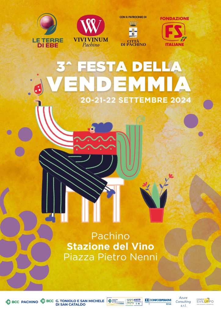 La Festa della Vendemmia è organizzata da Vivi Vinum Pachino in collaborazione con la nuova Cooperativa di Comunità Le Terre di Ebe, con il patrocinio del Comune di Pachino, ed anche grazie al progetto Vino Connect Sicilia, l’acceleratore della filiera vitivinicola siciliana, in sinergia con la Bcc Pachino e la Bcc di San Cataldo, Federcasse, Confocooperative Sicilia, supportato da Azure Consulting e finanziato da Fondo Sviluppo Spa.
