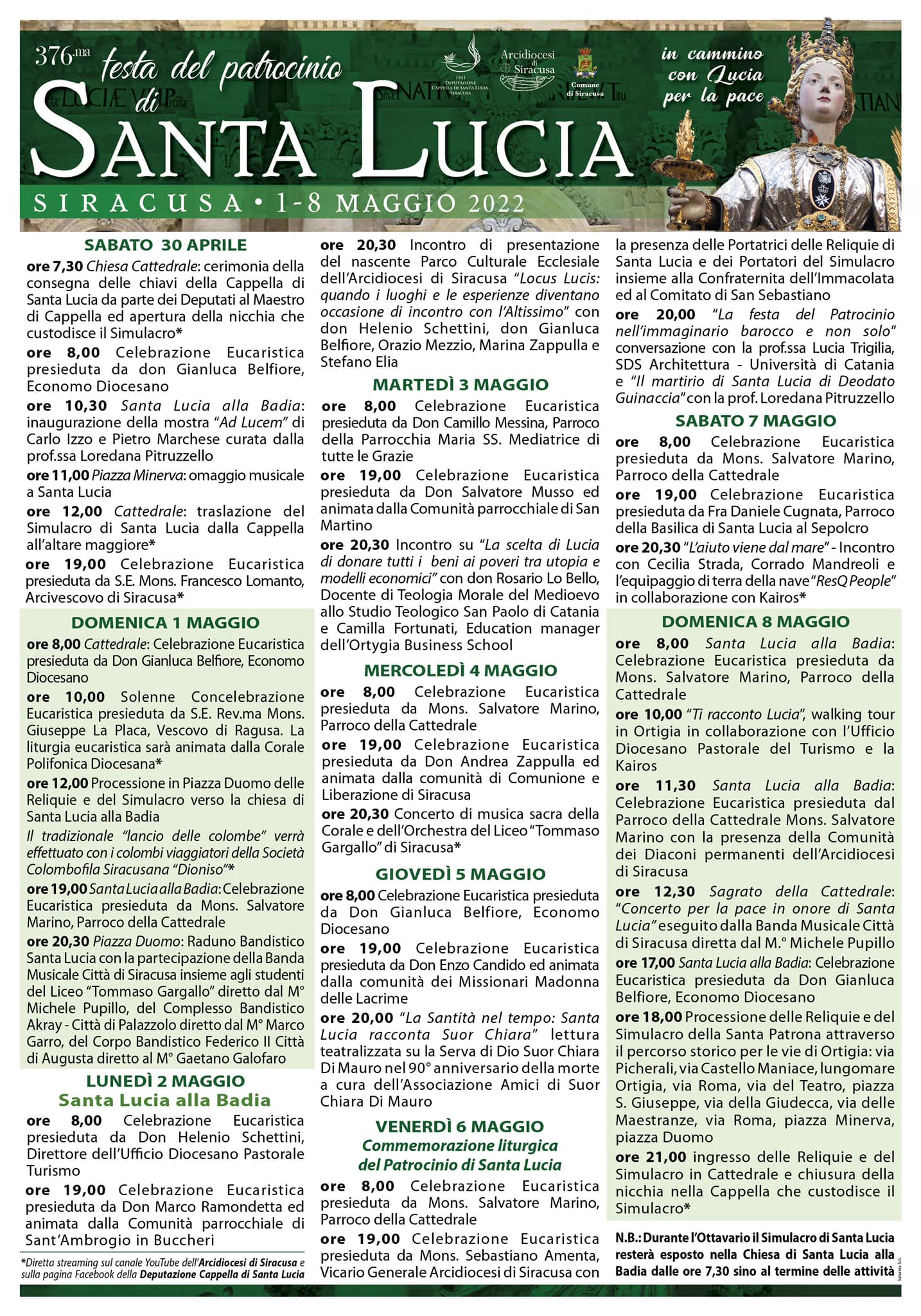 Durante l’Ottavario il simulacro di Santa Lucia rimarrà esposto nella Chiesa di Santa Lucia alla Badia, dalle ore 7,30 e fino al termine delle attività. Tutti i dettagli delle giornate di festa sono consultabili sul programma completo, scaricabile online.