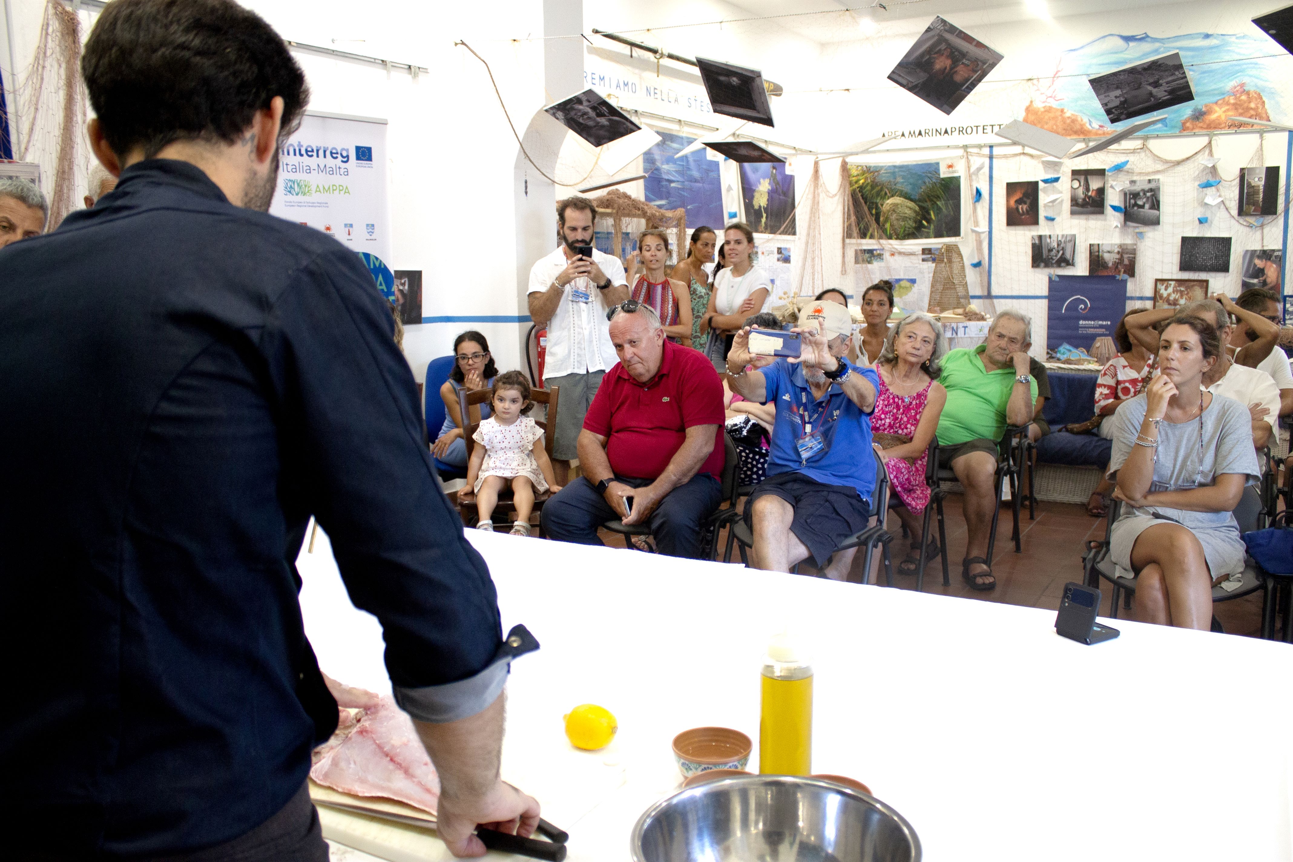 Gli incontri hanno avuto luogo nella suggestiva sede dell’Area Marina Protetta che ha accolto i partecipanti e i curiosi tra le emozionanti istallazioni temporanee della mostra Tesori del Mare. Interamente costruita con i materiali di riciclo raccolti nel mare e nelle coste dell’isola, l’esposizione ha offerto una cornice indimenticabile dove si sono svolti i due showcooking a cura dello chef de Il Terrazzino di Ustica, Manlio Forestieri: la prima, dedicata alla preparazione di un piatto di linguine agli agrumi con tartare di alalunga locale; la seconda, incentrata sulle tecniche di sfilettamento del pesce con la descrizione delle proprietà organolettiche di un dentice di 5 kg, pescato nelle coste dell’isola, e poi servito in tartare.