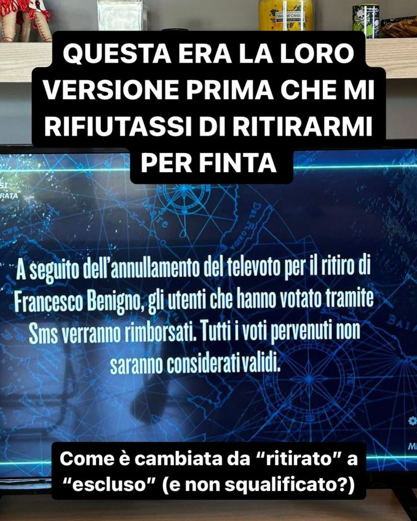 “Questa era la loro versione prima che mi rifiutassi di ritirarmi per finta“, ha scritto. “Se fossi stato escluso per motivi validi, perché inventarsi un falso ritiro?”, si chiede Benigno. Nella foto, si vede una schermata uguale a quelle utilizzate dalla produzione de L’Isola dei Famosi, in cui si legge: “A seguito dell’annullamento del televoto per il ritiro di Francesco Benigno, gli utenti che hanno votato tramite sms verranno rimborsati. Tutti i voti pervenuto non saranno considerati validi”.