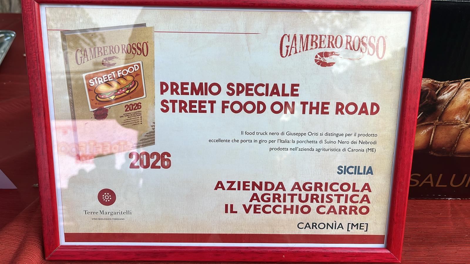 La porchetta dell’azienda “Il Vecchio Carro” che gira l’Italia in food truck è la migliore proposta gastronomica su ruote d’Italia. Questa la motivazione del premio: “Un food truck che porta in giro per l’Italia un prodotto di grande caratura, l’inimitabile porchetta di Suino Nero dei Nebrodi dell’azienda agrituristica di Giuseppe Oriti di Caronia, in provincia di Messina. Ovviamente a farcire splendidi panini”.