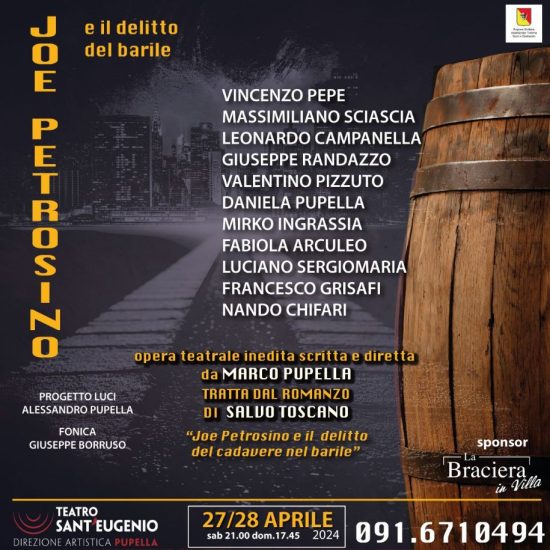 L’opera, è tratta dal romanzo del giornalista Salvo Toscano dal titolo “Joe Petrosino. Il mistero del cadavere nel barile” (Newton Compton Editori). Una produzione teatrale che offrirà una rappresentazione che trae origine da un reale fatto di cronaca avvenuto nella New York dei primi del ‘900, e che vedrà in scena gli attori: Vincenzo Pepe, Massimiliano Sciascia, Leonardo Campanella, Giuseppe Randazzo, Valentino Pizzuto, Daniela Pupella, Mirko Ingrassia, Fabiola Arculeo, Luciano SergioMaria, Francesco Grisafi, Nando Chifari. Fonica a cura di Giuseppe Borruso, e progetto luci di Alessandro Pupella.