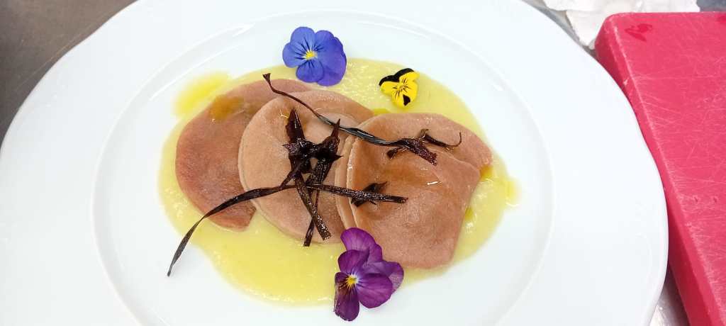A conquistare la giuria, tecnica e popolare, presieduta da Giusi Battaglia (Giusina in cucina), è stato il suo piatto dal nome evocativo: “Mezzelune di Sicilia… in terra”. Una creazione che racconta una cucina contemporanea, sostenibile e profondamente legata al territorio. L’impasto, realizzato dalla Savasta sul momento, nasce da semola rimacinata arricchita con purea di rapa rossa, senza aggiunta di acqua grazie alla naturale umidità dell’ingrediente. Il ripieno è una crema di melanzane con provola affumicata, mentre la decorazione diventa manifesto di una filosofia precisa: chips ottenute da bucce di melanzana e scarti di finocchio, trasformati in elementi croccanti e raffinati a cui sono stati aggiunti fiorellini di campo. Un piatto vegetariano che ha saputo superare proposte a base di ingredienti decisamente più gustosi, come gamberoni, formaggio e salsiccia, ribaltando le aspettative e dimostrando che innovazione e semplicità possono fare la differenza.