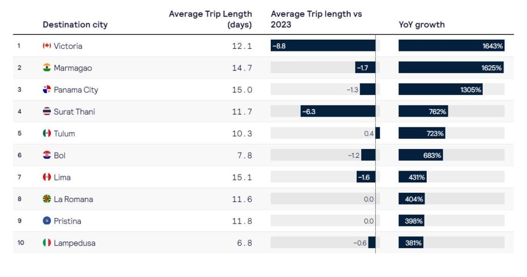Victoria, la capitale della Columbia Britannica canadese, e Marmagao, nello stato indiano meridionale di Goa, hanno registrato un aumento di interesse di oltre il 1.600% rispetto allo stesso periodo dell’anno scorso, con Panama City in crescita di oltre il 1.300%. Tutti hanno una durata media del viaggio di circa due settimane.