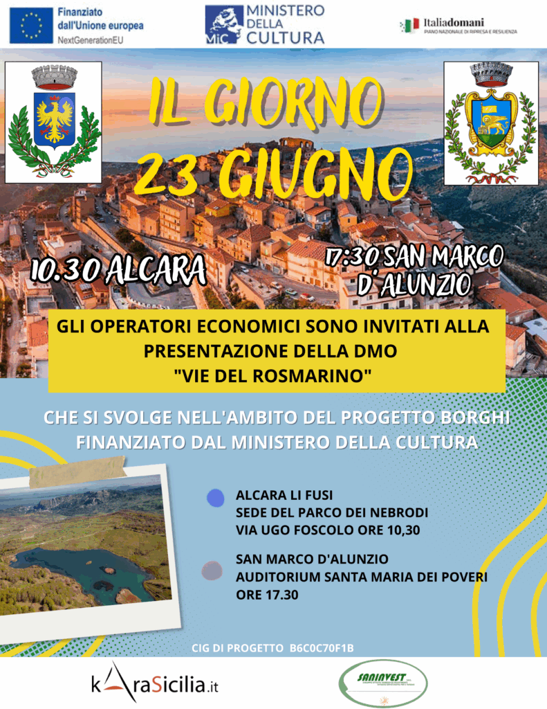 Lunedì 23 giugno sarà presentata ufficialmente la nuova DMO “Le Vie del Rosmarino”, il soggetto di gestione turistica che unisce i comuni di Alcara Li Fusi e San Marco d’Alunzio, nel cuore dei Nebrodi, con l’obiettivo di promuovere una strategia integrata di sviluppo e accoglienza nel comprensorio delle Rocche del Crasto.