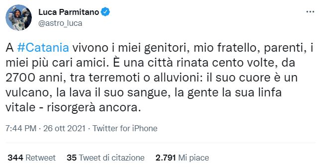 Il messaggio di Parmitano, pubblicato su Twitter, ha accolto moltissimi consensi e, in risposta, sono arrivate storie di siciliani e di parenti di siciliani, tra cui molti che vive lontano dalla Trinacria. Ecco le parole dell’astronauta catanese.