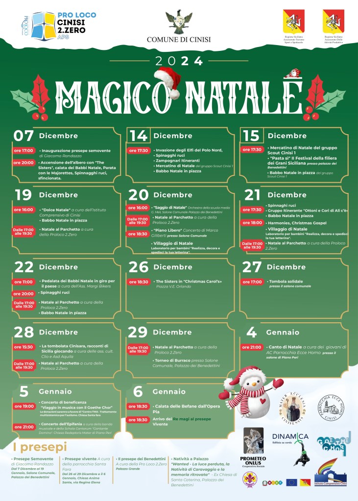 Cinisi si prepara a vivere “Magico Natale 2024”, un ricco cartellone di eventi organizzato dal Comune in collaborazione con la Pro Loco Cinisi 2.Zero APS e con il patrocinio della Regione Siciliana – Assessorato al Turismo, Sport e Spettacolo e dell’Assessorato delle Attività Produttive.