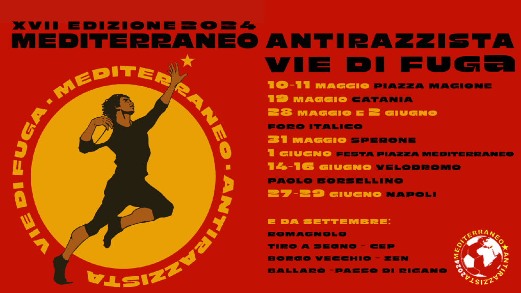 Torna per il diciassettesimo anno il Mediterraneo Antirazzista, che quest’anno ha come tema “Vie di fuga”. Mediterraneo Antirazzista è una manifestazione sportiva, artistica e culturale, organizzata da oltre 20 realtà cittadine tra associazioni, scuole, parrocchie e collettivi, la cui prima edizione si è svolta a Palermo nel giugno del 2008 per poi allargarsi a macchia d’olio nel resto d’Italia in città come Milano, Roma e Napoli, Genova, Catania e Lampedusa.