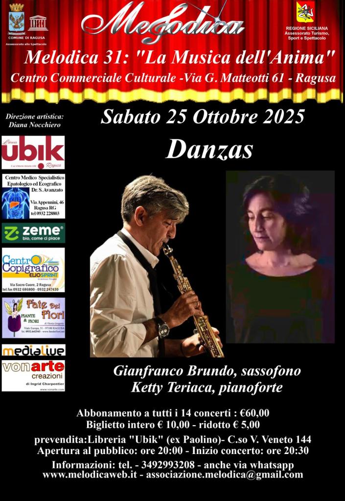 L’inaugurazione ufficiale si terrà sabato 25 ottobre, alle ore 20.30, con il concerto “Danzas”, affidato al sassofonista Gianfranco Brundo e alla pianista Ketty Teriaca. Il programma accompagnerà gli spettatori in un cammino sonoro tra le danze musicali di diverse epoche e culture, passando dalla raffinatezza delle forme europee alle suggestioni passionali del tango argentino. Una serata che evocherà atmosfere intense e vibranti, dove i ritmi popolari si intrecceranno con l’eleganza della musica colta, restituendo tutta la forza espressiva e comunicativa del linguaggio musicale.