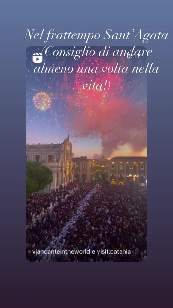 Proprio al bimbo è dedicato uno dei suoi immancabili hashtag: “#lifewithO“, cioè vita con Orlando, cui ha associato “#mimancasoloilmare” e “#accussì“. Nelle sue Stories, invece, l’attrice ha pubblicato un breve filmato che mostra i fuochi d’artificio per Sant’Agata, scrivendo: “Consiglio di andare almeno una volta nella vita!“.
