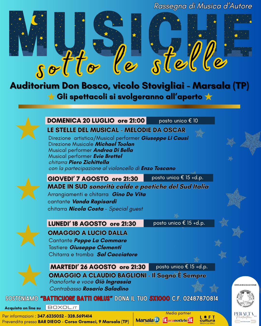 Oltre alla musica, la rassegna sostiene anche il sociale: “Musiche sotto le stelle” supporta l’associazione Batticuore Batti Onlus, a cui è possibile destinare il proprio 5×1000 (C.F. 02487870814).