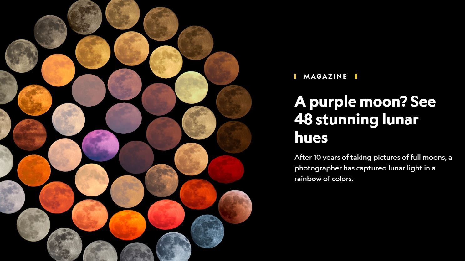 Come raccontato dalla fotografa siciliana all’AGI, “L’immagine dimostra come la nostra atmosfera restituisca colorazioni differenti al nostro astro. Le 48 Lune piene, sono state quasi tutte riprese mentre la Luna si trovava bassa sull’orizzonte dove la densità atmosferica, attraverso processi dello scatterering e rifrazione, favorisce colorazioni e forme diverse della Luna”.