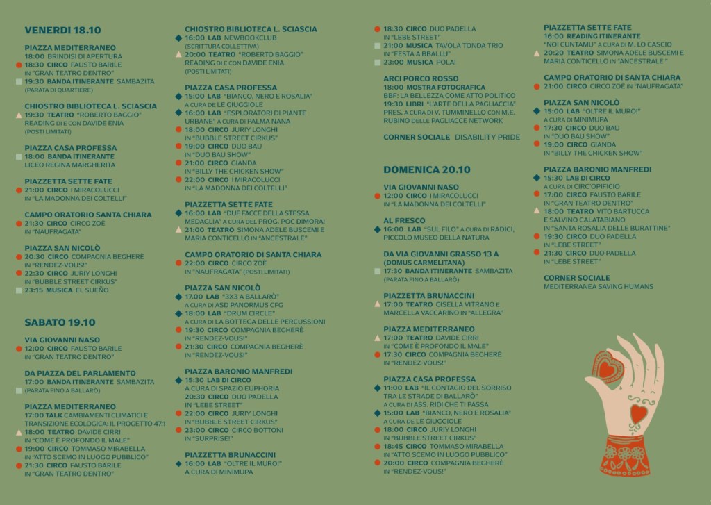 “In questa ottava edizione, il Festival raggiunge una dimensione ancora più grande – afferma il direttore artistico Riccardo Strano – grazie a un programma di altissima qualità che riflette l’importante lavoro svolto dal Ballarò Buskers Festival in questi 9 anni. A testimonianza di ciò, spiccano nomi come quello del drammaturgo Davide Enia, che porterà in scena un reading su Roberto Baggio, e la compagnia di circo contemporaneo Circo Zoè, che con il loro spettacolo “Naufragata”, già presentato in tutto il mondo, incanteranno anche il pubblico di Palermo. Oltre a loro, ci sarà una ricca varietà di spettacoli di teatro e circo, che si integreranno perfettamente con la natura stessa del Festival: dalle performance di Fausto Barile, che si esibirà nel cuore del mercato, ai Miracolucci che reinterpreteranno la figura di Santa Rosalia in chiave circense, senza dimenticare la moltitudine di laboratori per bambini e ragazzi. Insomma: un’edizione che sorprenderà tutti”.