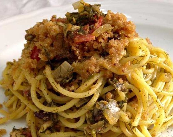 Mettete a lessare i finocchietti in abbondante acqua salata .Una volta cotti scolateli e tritateli avendo cura di conservare l’acqua di bollitura. Soffriggete nell’olio lo spicchio d’aglio tritato e unitevi il finocchietto, l’una passa, i pinoli e lo zafferano. Mescolate bene per qualche minuto, aggiungendo un mestolo di acqua di bollitura dei finocchietti, in modo da amalgamare tutti gli ingredienti. Cuocete i bucatini e scolateli al dente. Intanto in padella tostate il pangrattato con poco olio senza farlo bruciare e unitevi un cucchiaio di zucchero e mescolate bene. Condite la pasta con il condimento e spolverate con sopra la “muddica atturrata”.