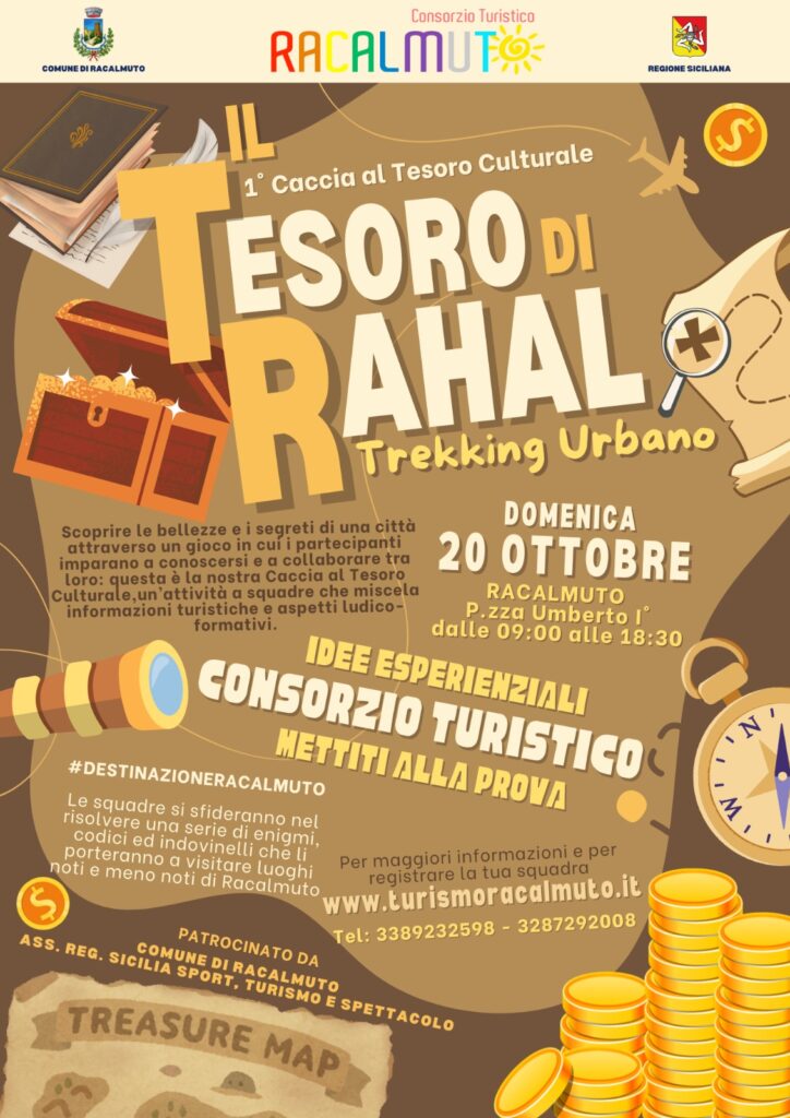 Una delle novità più attese proposte dal Consorzio è la prima edizione de ” Il Tesoro di Rahal”, che si terrà domenica 20 ottobre. Una giornata di trekking urbano che attraverso le modalità della caccia al tesoro invita turisti e residenti a scoprire i tesori nascosti del borgo tra siti di interesse storico e culturale, tradizioni secolari e sapori locali. Infatti, durante la giornata, i partecipanti avranno la possibilità di gustare le eccellenze gastronomiche di Racalmuto, come i prodotti a Denominazione Comunale, autentici simboli della cucina locale.
