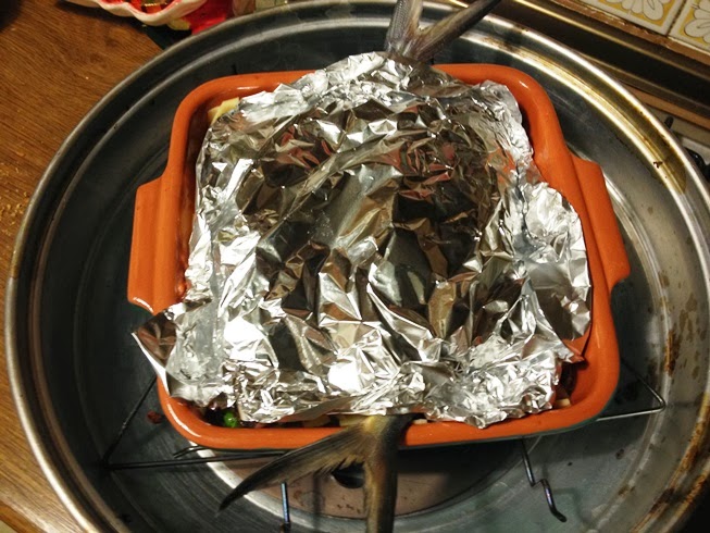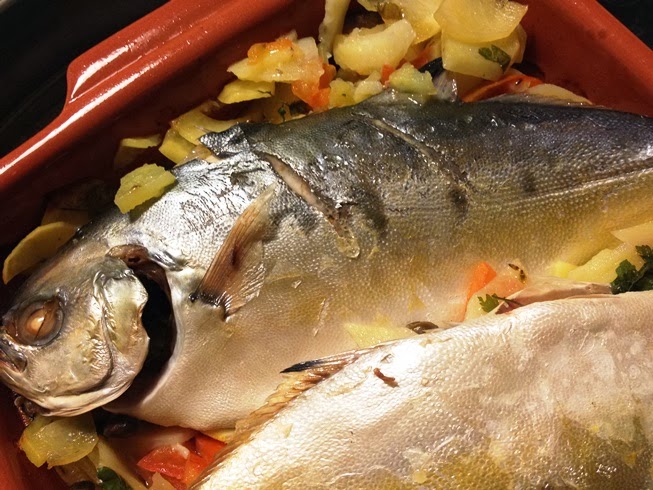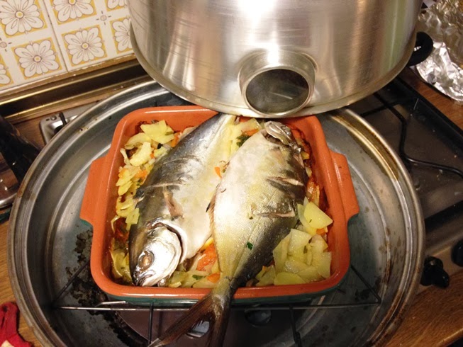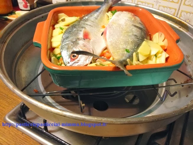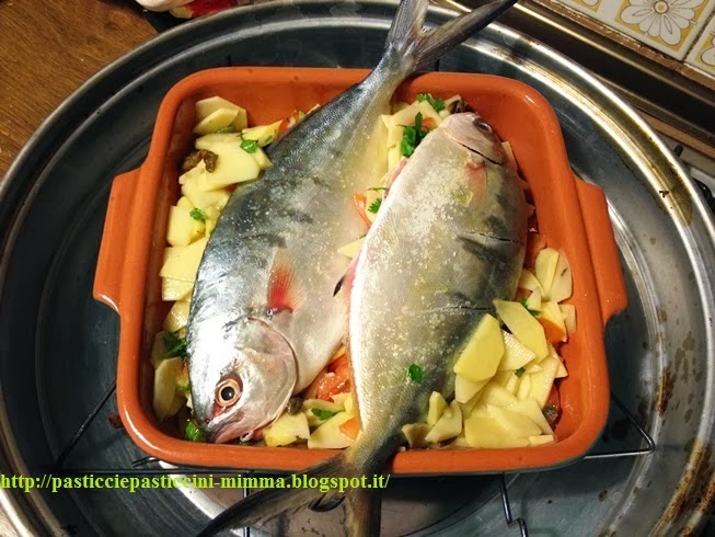 La cottura è in forno e il pesce viene adagiato su un letto di patate, tagliate sottilissime, a mano o con la mandolina o con un robot e condite con olio, pomodorini di Pachino, prezzemolo, sale, peperoncino e, naturalmente CAPPERI SALATI!!!