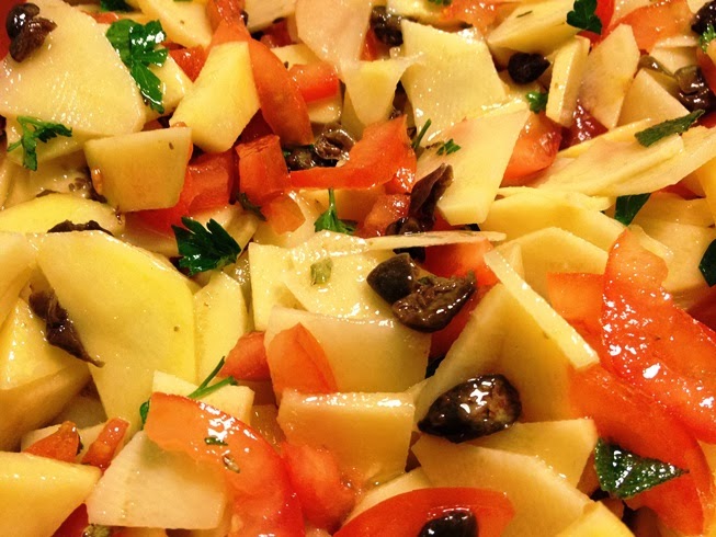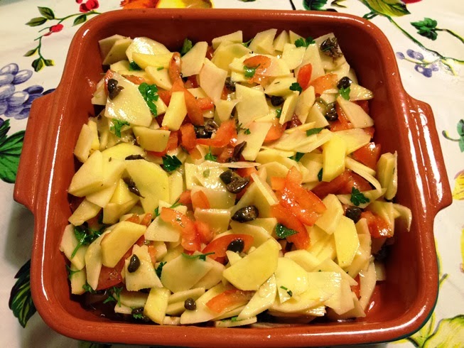 – mescolare in una ciotola le patate, i pomodorini a pezzetti, l'aglio tritato finissimo, i capperi dissalati, il prezzemolo, il peperoncino, il sale e abbondante olio d'oliva