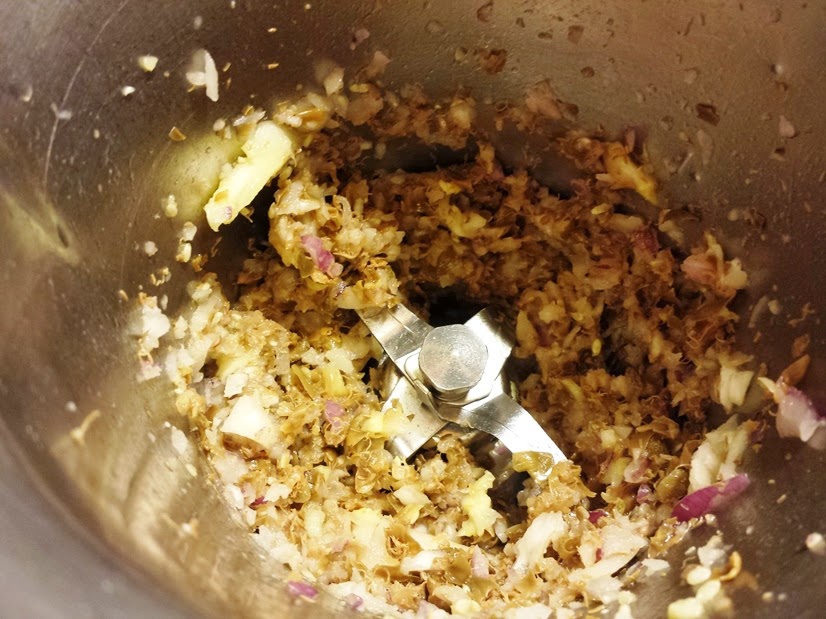 – preparare il ripieno tritando grossolanamente la polpa scavata dagli ortaggi, una cipolla piccola, le mandorle tostate, il sale aromatico, i capperi e olio d'oliva