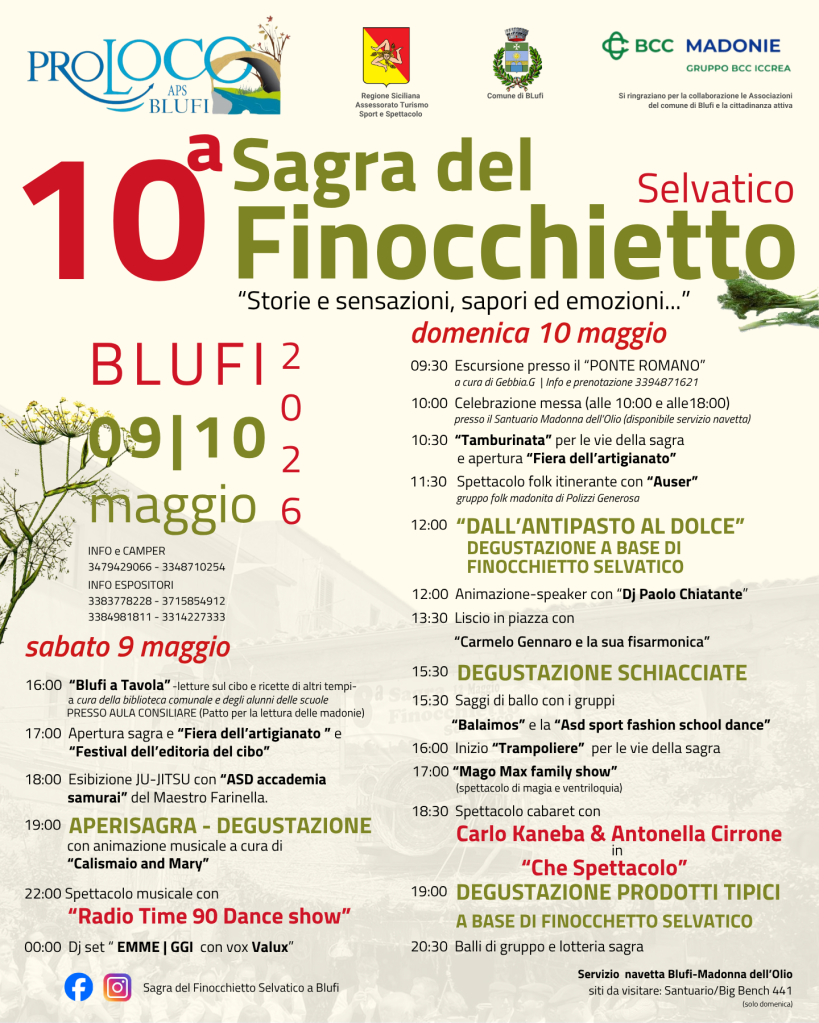 Ad aprire l’evento, alle ore 16 del prossimo 9 maggio presso l’aula consiliare del Comune, “Blufi a tavola”, letture sul cibo e ricette di altri tempi- a cura della biblioteca comunale e degli alunni delle scuole. Poi, alle 17, l’inaugurazione ufficiale della sagra con annesse la “Fiera dell’artigianato ” e il “Festival dell’editoria del cibo”. Spazio, come sempre anche all’intrattenimento e agli spettacoli: alle ore 18 esibizione di Ju-Jitsu con Asd Accademia Samurai del Maestro Farinella; alle ore 19 ‘APERISAGRA’ con animazione musicale a cura di ‘Calismaio and Mary’ e degustazione di prodotti al finocchietto; infine alle ore 22 lo spettacolo musicale- “Radio Time 90 Dance show”, e dalla mezzanotte Dj set EMME|GGI con Valux.