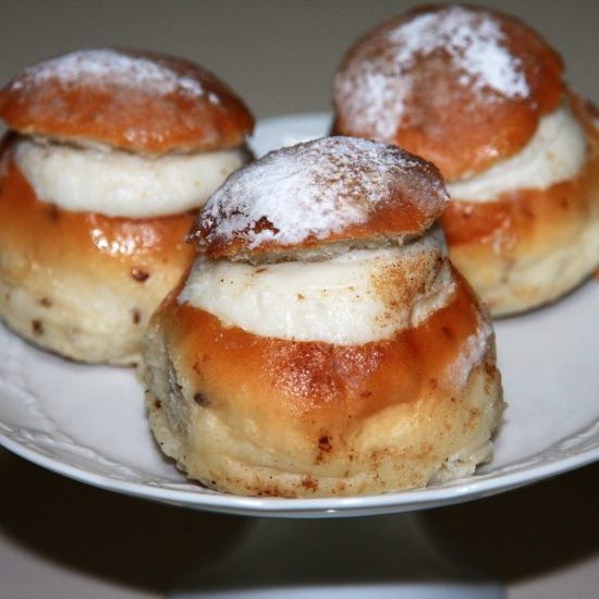 Procedete come nella prima ricetta, mettete i biscotti in forno a fuoco moderato e tirateli fuori quando sono cotti ma morbidi. Tagliateli in due parti, di cui una sia pari ai 2/3 e l’altra 1/3 dell’intero e lasciate raffreddare. Bagnate leggermente le due parti con il moscato. Passate la ricotta 3 volte al setaccio al fine di ottenere una crema soffice e spumosa, lavoratela con lo zucchero a velo.Mettete sulla base (la parte più spessa) la crema di ricotta e coprite con il “cappello” (la parte più sottile).Spolverate la parte superiore con zucchero a velo e cannella in polvere.