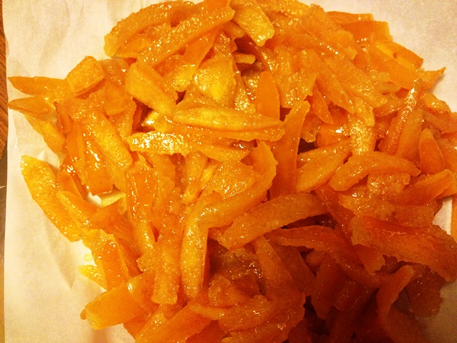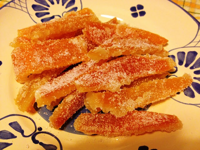 Io ne preparo sempre grosse quantità perché ho la fortuna di avere degli amici cari che mi regalano le loro arance biologiche, quindi utilizzo la polpa per fare un'ottimamarmellata di arance , che trovate QUI' , e le bucce per candirle e consumarle sia così, sia immerse nel cioccolato fondente, sia tritate e amalgamate a cioccolata bianca per dei deliziosi bon-bon profumatissimi e sempre molto apprezzati (anche questi posterò a breve).